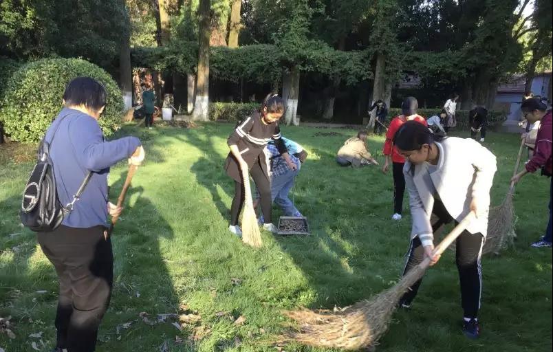 志愿者在打扫北楼的草坪