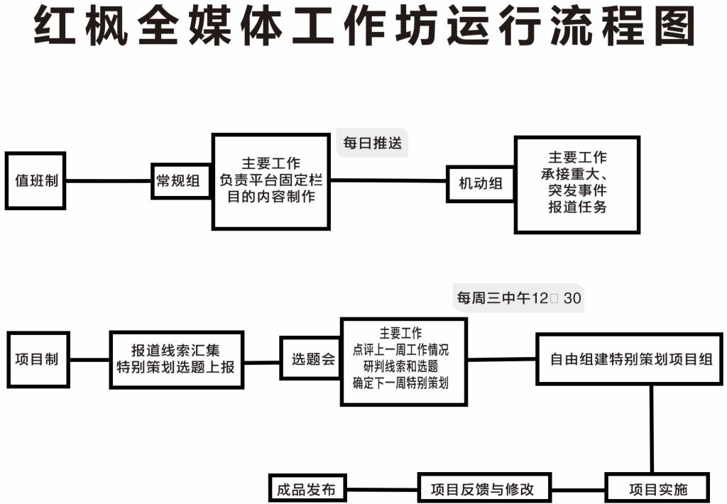 在相对成熟的组织架构下,红枫全媒体工作坊相应地配套了完整的运行流程,值班制与项目制并行。