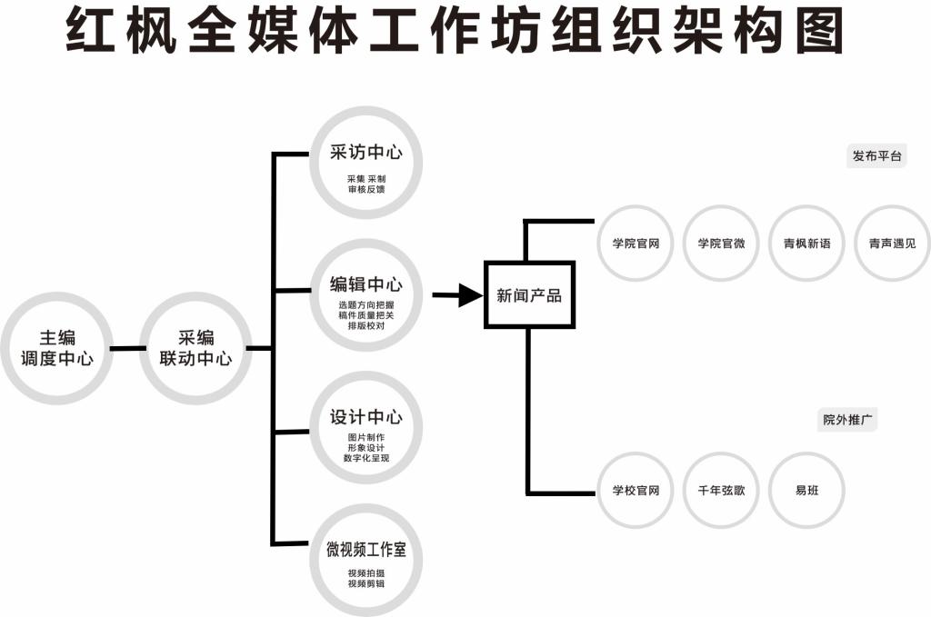红枫全媒体工作坊作为大学生全媒体实践平台的先行军,在配备大型硬件设施之前,优先设置了“中央厨房”式的采编发网络和采编发流程,精心设计组织架构,形成“一次采集、多种产品、多媒体传播”的工作格局。