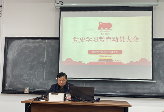 动员大会上,胡建国书记结合全国党史学习教育以及学校、学院层面相关工作部署,强调了在建党100周年的重要节点、在新时代新局势下加强学习党史的重要意义,并代表院党委对各位党员同志提出了学习要求:要落实党史学习教育活动的有效开展,要努力做到提高政治站位,聚焦目标重点、紧扣发展大局和力求保质保量。