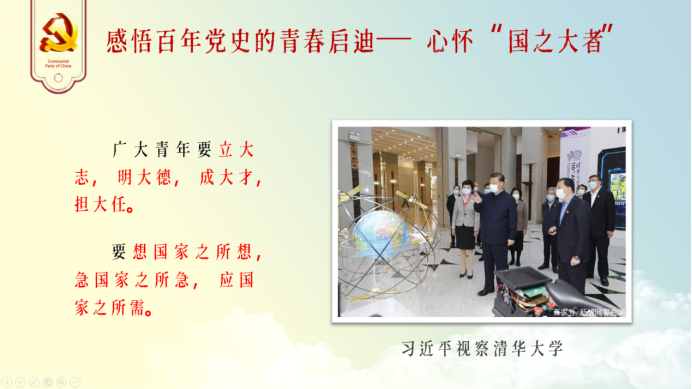 2021年4月19日,习近平总书记来到清华大学发表了重要讲话,提出广大青年要立大志、明大德、成大才、担大任,“要想国家之所想、急国家之所急、应国家之所需”。回望百年党史,只有心怀“国之大者”,才能担当民族复兴重任。