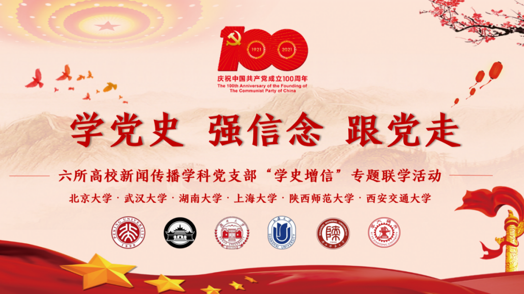 、西安交通大学、北京大学、武汉大学、上海大学、陕西师范大学等六校新闻传播学科研究生党支部,举行了“颂党史,强信念,跟党走”专题联学活动。来自各高校新闻传播类学科学院、研究生工作部的十余位领导老师,以及120余名党员同志参与本次线上专题联学活动。