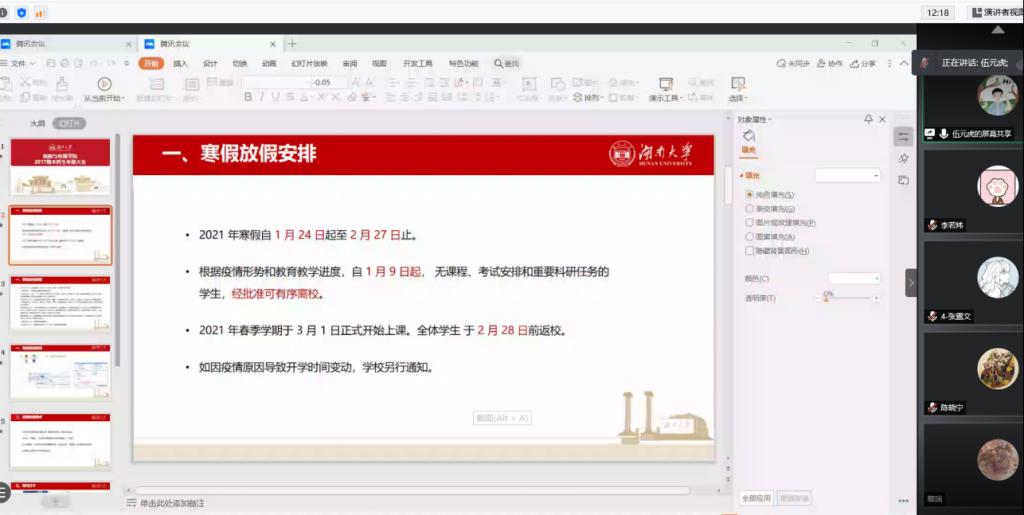 会议中,伍老师表示,为了保障学生安全,且考虑到近期各地疫情反弹情况,目前家乡为中高风险地区的同学可以不急于回家,学工部已在制订更为详尽的工作方案,有关寒假的具体安排一旦有所调整,学院会第一时间下达通知,望同学们稍安勿躁;