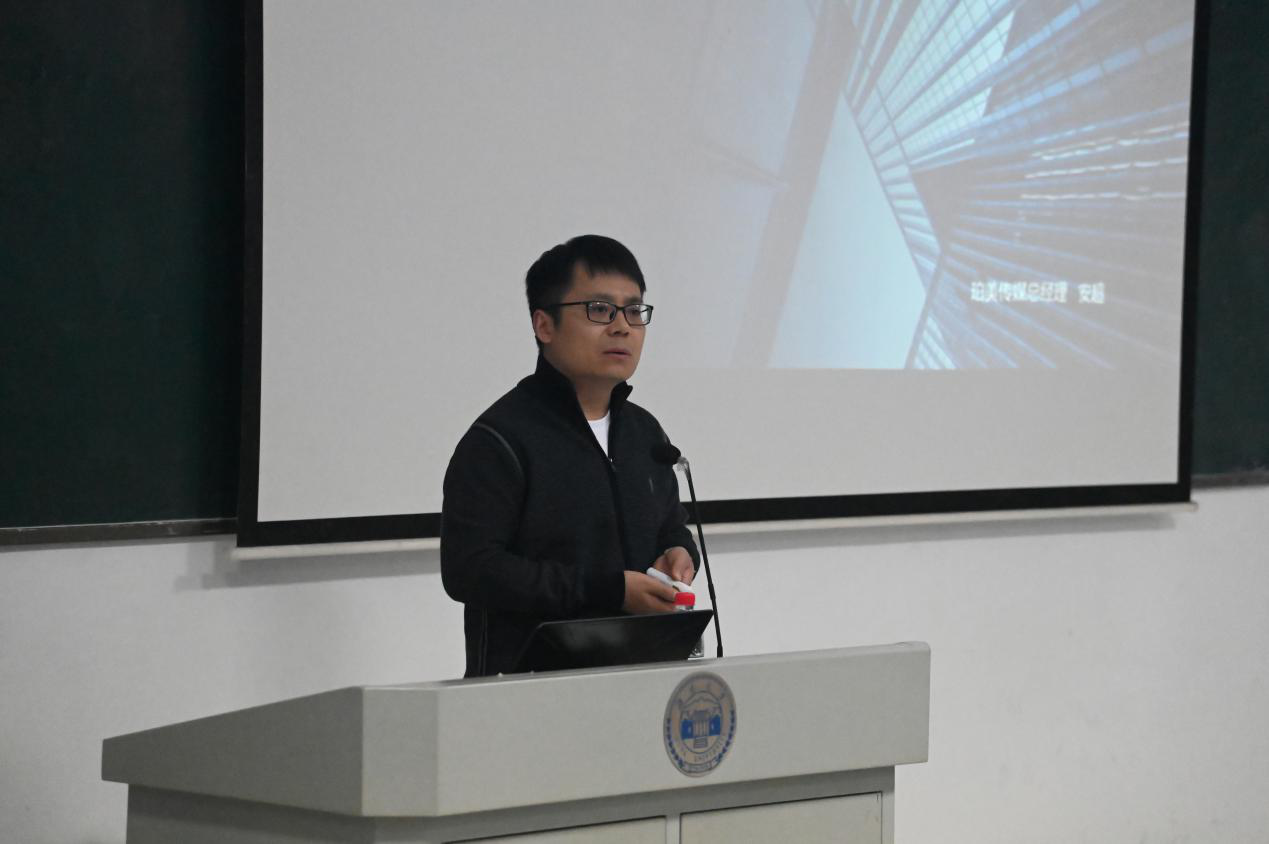 发展联络处(教育基金会)伍旺老师,全体辅导员及新传院本科、研究生代表参加讲座。讲座以“专注、极致、坚韧、顺势”为主题,讲述安超校友毕业后工作及创业经历,分享自己的成功经验和心路历程,对于同学们的职业规划及未来发展提出指导建议。