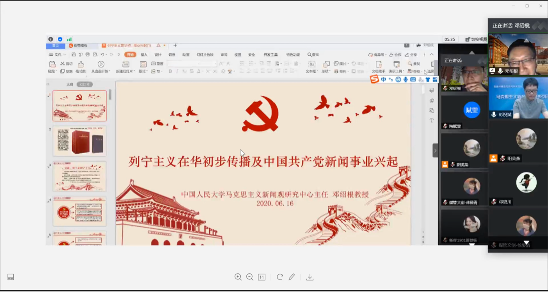 马克思主义新闻观研究中心,于“云端”腾讯会议室举办了一场别开生面的学术讲座。此次讲座以“列宁主义在华初步传播与中国共产党新闻事业的兴起”为题,由中国人民大学新闻学院教授、中国新闻史学会联席秘书长、中国人民大学马克思主义新闻观研究中心主任邓绍根教授担任主讲,我院院长彭祝斌教授主持,新影院和学界300余名师生在线参与。