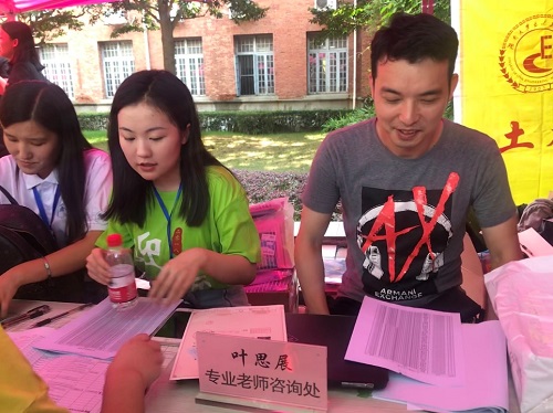 尽管天气炎热,但叶老师却始终坚守,与所有的迎新志愿者一样,为新生入学报到站好第一班岗。