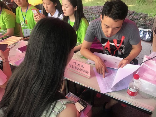 从下午两点半到六点半,作为首位进行答疑的叶思展老师,在迎新点一坐就是整整一个下午。叶思展老师从教于广播电视编导专业,人称“叶帅”,虽然他长得年轻,但在新影院从事教学工作已有十六年了。他悉心地为同学们介绍专业课程情况及转专业政策,帮助新生及家长在第一时间了解学院的专业情况。