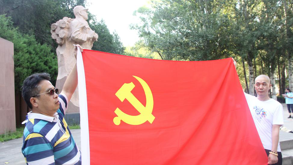在毛主席悼念张思德的“为人民服务讲话台”,全体党员肃立在张思德的雕像前,在陈功老师的引领下,齐声诵读了毛主席为张思德同志而作的《为人民服务》篇章;随后,大家面对党旗,庄严举起右手重温入党誓词。