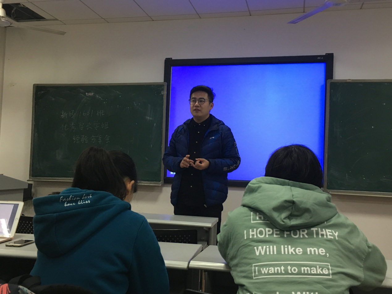 12月7日下午四点,新闻传播与影视艺术学院新传1601班在综合楼开展优秀学长学姐经验分享会。会上,同学们热情高涨,争相向学长学姐请教。