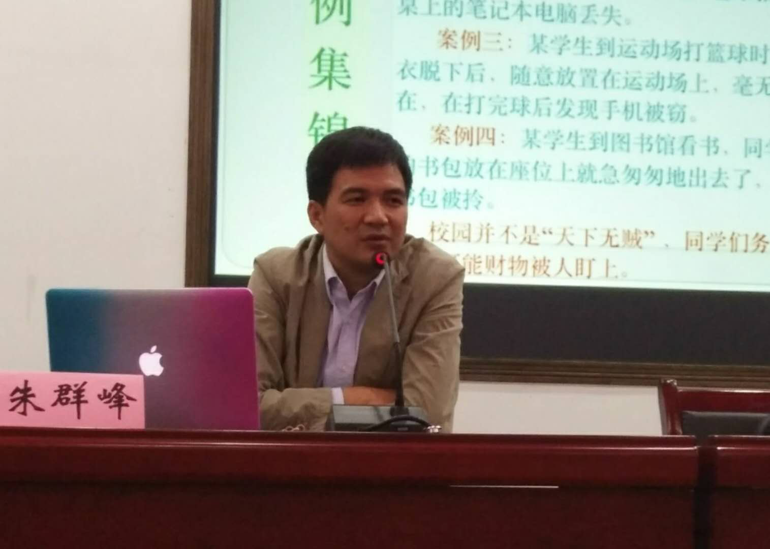 在讲座上,朱群峰老师结合具体事例阐释了当代大学生安全意识缺乏的表现,提醒同学们安全问题不容忽视,并通过对典型案例的分析,总结经验教训。朱群峰老师还分别就人身安全和财产安全两方面与同学们展开探讨。