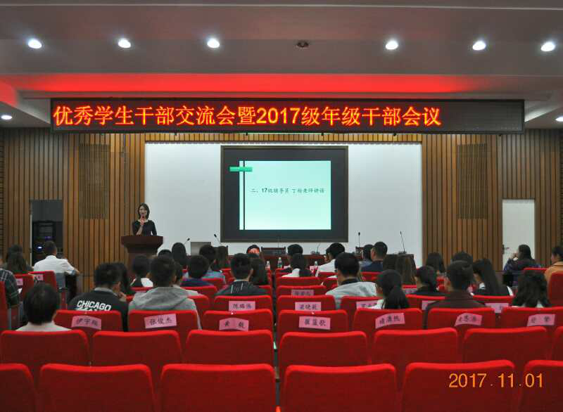 北楼217报告厅召开。17级辅导员丁杨老师出席会议并进行指导,14、15级部分优秀学生干部参加会议并分享工作经验,2017级全体学生干部参加会议。