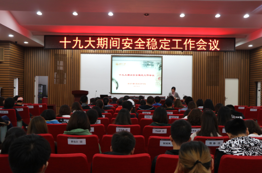 新闻传播与影视艺术学院在北楼217教室召开学生干部大会,会议部署了十九大期间有关安全稳定方面的工作。学院党委书记胡建国,党委副书记兼副院长程华,学工办主任刘婵,辅导员刘佳、丁杨、潘少光老师出席会议。学院分团委、学生会全体成员,研究生会主要干部、年级长、团总支以及各班班长、团支书参加会议。本次会议由程华副书记主持。