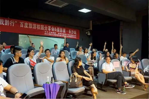本次分享会内容丰富多彩,包括贵州民族风情歌舞、资深导游真诚推介;旅游达人生动分享、趣味十足的有奖问答和互动等。主持人简单开场后,可爱的苗族姑娘以一支独具民族风情的舞蹈《苗秀》拉开了分享会的序幕。接着,仝晓琳女士代表百度旅游给“百度旅游最受欢迎目的地——贵阳”颁奖,贵阳旅发委代表杨辉先生上台领奖,全场用热情的掌声表示了真诚的祝贺。然后,风趣幽默的贵阳资深导游石园园的真诚推介更是把22度爽爽的贵州带给了32度燥热的长沙,湖南学子们感到了阵阵凉爽和惬意。三个帅气的贵州小伙的歌舞《阿且朵》也展示了贵州的另一番豪迈洒脱。