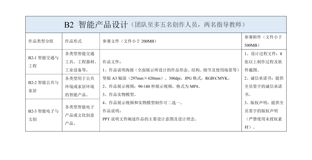 B 类为主题创作赛。B 类包括:B1 全媒体设计;B2 数字智能产品设计。B1 全媒体设计,细分以下类别单独评审:B1-1 数字影像动画设计(影视、动画、微电影)、B1-2 数字绘画设计、B1-3 数字交互设计、B1-4 数字音乐设计。B1-1 数字影像动画设计分为两个竞赛单元:数字影视组;数字动画组。借助数字化设备、采用影视拍摄或动画制作技术进行创作,反映一定故事情节或体现人文、历史、景观、文化特征的作品,形式包括但不仅限于影视短片、微电影、数字短片、纪录片、二维或三维动画等。B1-2 数字绘画设计分为两个竞赛单元:静态绘画组及动态绘画组。创作需基于数字技术及数字综合媒介,作品应主题突出,创作形式具有创新性,风格特色鲜明,视觉冲击力强。B1-3 数字交互设计分为三个竞赛单元:交互 App 设计;微信小程序游戏设计;HTML5 设计。交互设计类作品需具有良好的应用价值,功能架构具有一定的创新性,界面视觉体验良好、交互设计合理且可用性强。B1-4 数字音乐设计分为三个竞赛单元:音乐视频 MV、影视声音设计、录音作品。采用 MIDI 或数字音频技术录制的原创音乐作品,内容健康、积极向上。B2 数字智能产品设计,细分以下类别单独评审:B2-1 数字智能交通与工程(各类型智能交通工具、工程器材、工业设备等);B2-2 数字智能公共与家居(各类型用于公共环境或家居环境的智能产品);B2-3 数字智能电子与文创(各类型智能电子产品或文化创意产品)。突出数字创意设计的大赛主题,体现智能化生活。借助数字化设备,采用三维建模及动画制作技术进行相应创作。参赛内容具体要求详见附件一。